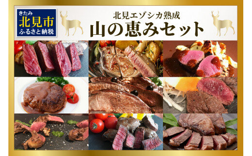 北見エゾシカ 熟成肉山の恵みセット ( 肉類 肉 国産 鹿肉 熟成 セット 詰め合わせ 骨付き ロース しんたま 内もも ステーキカット肉 ハバキカット ハツ ヒレ ステーキ用スライス )【025-0030】