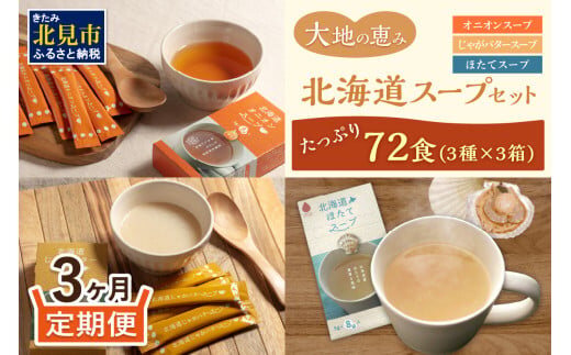 【3ヵ月定期便】ほっとひといき。スープ72食 ( スープ 北海道 玉ねぎ たまねぎ タマネギ 野菜 定期便 即席 注ぐだけ 個包装 じゃがバター ほたて 簡単 )【999-0190】