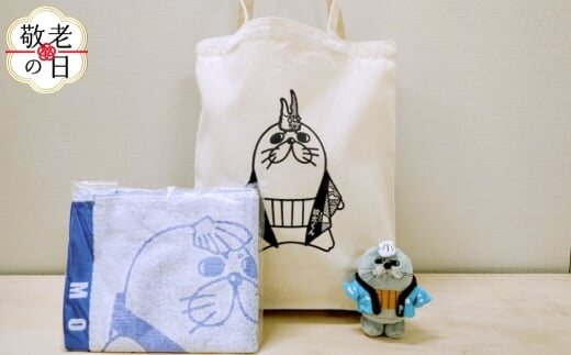 16-134 【敬老ギフト】ゆるキャラ紋太グッズ(トートバック・ぬいぐるみ小、タオル[ブルー])