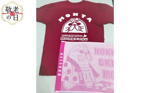 17-182 【敬老ギフト】ゆるキャラ紋太・べつこグッズ(Tシャツ[バーガンディーM]、タオル[ピンク])