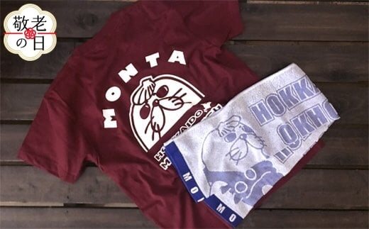 17-187 【敬老ギフト】ゆるキャラ紋太グッズ(Tシャツ[バーガンディーL]、タオル[ブルー])