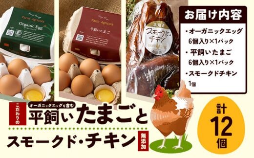 容量 | 平飼いたまご6個入×1パック、オーガニックエッグ6個入×1パック、スモークドチキン×1個 |