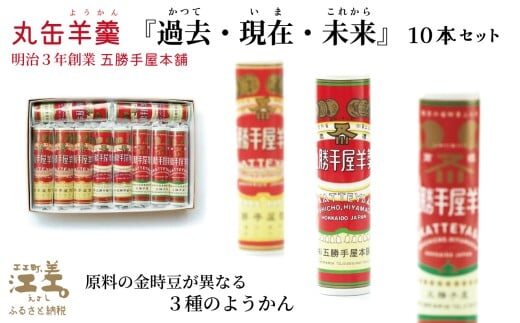【数量限定】五勝手屋本舗『丸缶羊羹(ようかん)過去・現在・未来』10本セット 五勝手屋羊羹の「かつて・いま・これから」 金時豆 大正金時 紅金時 秋晴れ ようかん 復刻 保存料不使用 老舗 和菓子 銘菓 ギフト 贈答