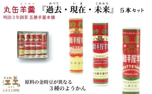 【数量限定】五勝手屋本舗『丸缶羊羹(ようかん)過去・現在・未来』5本セット 五勝手屋羊羹の「かつて・いま・これから」 金時豆 大正金時 紅金時 秋晴れ ようかん 復刻 保存料不使用 老舗 和菓子 銘菓 ギフト 贈答