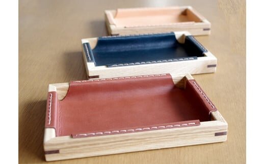 容量 | レザートレー1点、サイズ/幅:210mm 奥行:158mm 高さ:30mm 素材/北海道産ナラ、オイル塗装仕上げ 色/ネイビー(革部分) |