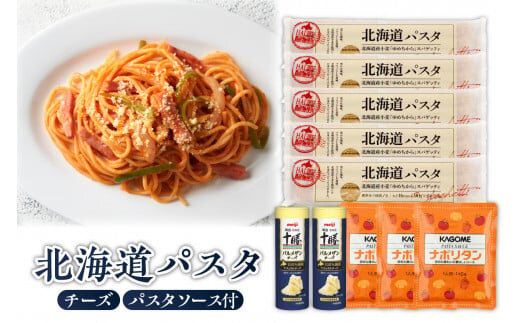 「北海道パスタ」と「明治北海道十勝のパルメザンチーズ」、「KAGOME ナポリタンソース」のセットです。