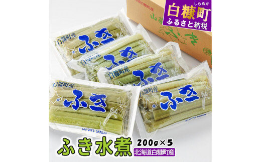 ふき水煮(200g×5) 原産地 北海道白糠町 原材料名 塩蔵ふき/漂白剤(次亜硫酸ナトリウム)、PH調整剤、酸化防止剤(ビタミンC)、リン酸塩(Na)、ミョウバン 保存方法 直射日光を避け常温で保存してください |