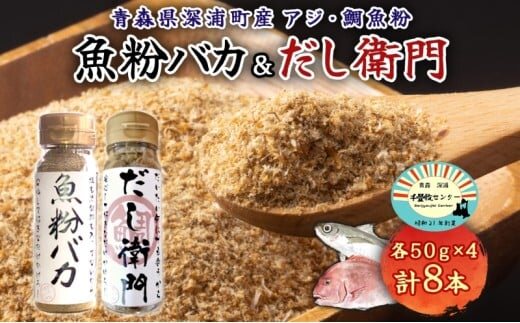 だし粉 魚粉バカ 50g ×4本 だし衛門 50g×4本 8本セット 出汁 だし 粉末 アジ 鯵 塩分 カット 魚まるごと 旨味 煮物 魚介 焼き干し ラーメン 味噌汁 お手軽 青森県 深浦町