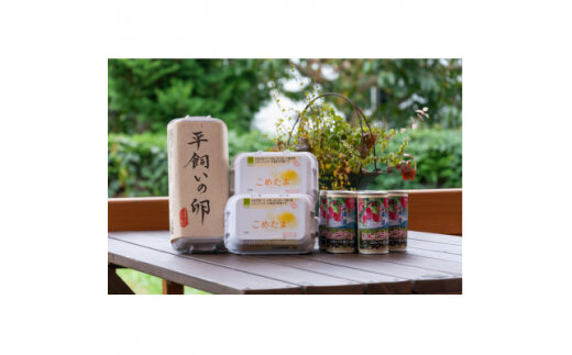 こめたま、平飼いの卵、そして、土作りからこだわってできたりんご使用のストレート果汁のリンゴジュースのセットです。