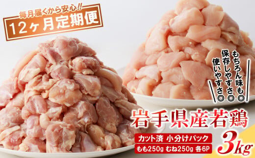 【12カ月定期便】「便利な小分け、カット済!」岩手県産若鶏 もも、むね肉セット 計3kg