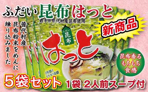 「普代の昆布は肉厚で歯ごたえがあっておいしい」と評判も良く、村自慢の海産物の一つです。その昆布の粉末を練り込んだ、昆布の持つ磯の香りが広がるのどごしなめらかな「はっと」です。フワッと広がる昆布の風味、クセになるもちもち食感をお楽しみください。料理研究家で普代村の昆布大使である小野寺惠先生が監修しました。