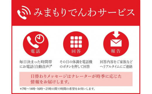 角田市で暮らす親御様等に、毎日お電話(自動音声)で体調確認を行い、その結果をご家族様へメールでお知らせするサービスです。(3か月間)