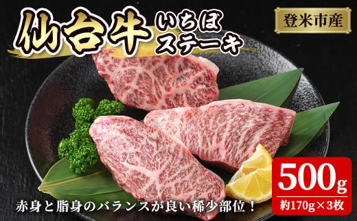登米市産 仙台牛 いちぼ ステーキ 500g(約170g×3枚) 肉 お肉 にく 牛肉 イチボ 赤身 ステーキ 国産 宮城県産 バーベキュー 冷凍【株式会社佐利】tm236