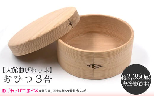 こちらの返礼品は、「曲げわっぱ工房E08」(いーわっぱ)の、3合用のおひつです。
