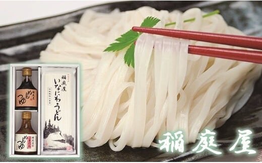 つるつる喉ごしでコシの強い当店自慢のいなにわうどん。本醸造醤油をベースにかつおと昆布ダシを効かせためんつゆと特製ごまだれめんつゆのセットです。