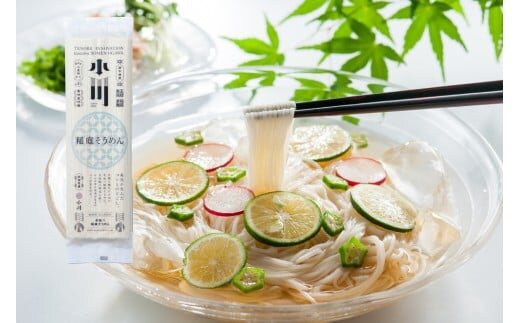 油を一切不使用の稲庭そうめん。ツルツルした食感、豊かな小麦の風味、細麺ながらもしっかりとしたコシの強さが特徴です。