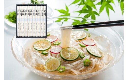 油一切不使用の稲庭そうめん。ツルツルとした食感、豊かな小麦の風味、細麺ながらもしっかりとしたコシの強さが特徴です。
