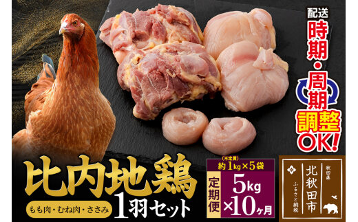《定期便10ヶ月》 比内地鶏 1羽セット(もも肉・むね肉・ささみ)約5kg(約1kg(不定貫)×5袋)×10回 計50kg 時期選べる お届け周期調整可能 10か月 10ヵ月 10カ月 10ケ月 50キロ 国産 冷凍 正肉 鶏肉 鳥肉