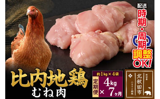 《定期便7ヶ月》 比内地鶏 むね肉 4kg(1kg×4袋)×7回 計28kg 時期選べる お届け周期調整可能 7か月 7ヵ月 7カ月 7ケ月 28キロ 国産 冷凍 鶏肉 鳥肉 とり肉 ムネ肉