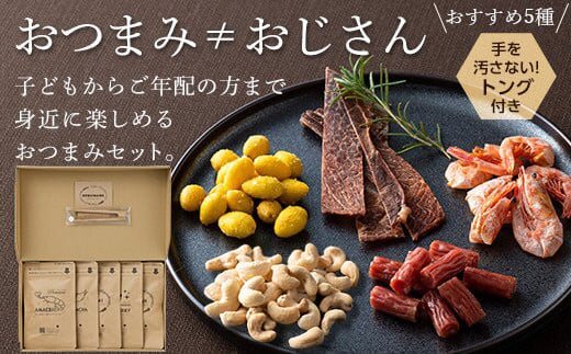 ・脱おじプレミアム桃色えびちゃん8g ・脱おじプレミアムナッツ界のアイドル*カシューナッツ*50g ・脱おじプレミアムビーフジャーキー14g ・脱おじ米沢牛入りサラミ15g ・脱おじ塩ぎんなん22g ・山形県産木トング付 |