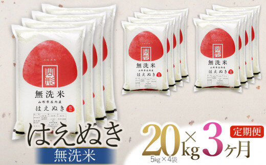 【令和7年産】【3ヶ月定期便】【新米】 はえぬき 無洗米 20kg (5kg×4袋) ×3回 (計60kg) 山形県庄内産 有限会社 阿部ベイコク