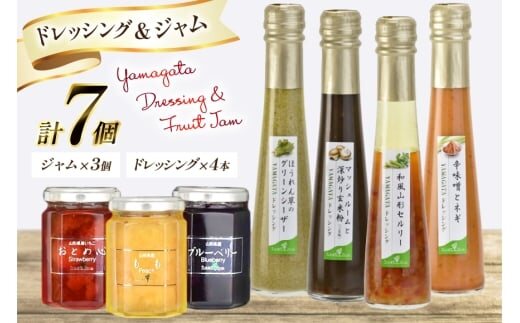 ジャム 145g×3 個、ドレッシング 122ml×4 本 ▼セット内容 〇ジャム:山形県産もも、山形県産いちご(おとめ心)、山形県産ブルーベリー 〇YAMAGATA ドレッシング:マッシュルームと深炒り玄米粉、辛味噌とネギ、和風山形セルリー、ほうれん草のグリーンシーザー |
