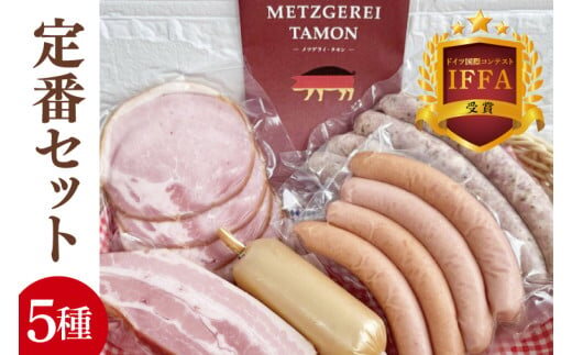 メツゲライ・タモン定番のロースハム、焼きソーセージ、ウィンナー、チキンローフ、いろいろなお料理に使えるベーコンのブロックをプラスした5品のセットです。