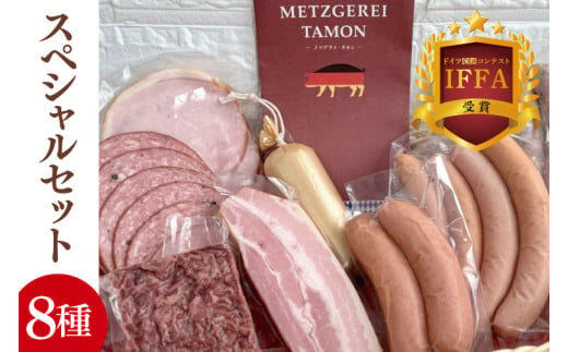 メツゲライ・タモン定番のロースハム、焼きソーセージ、フランクフルト、ウィンナー、ペッパーサラミ、コンビーフ、チキンローフ、いろいろなお料理に使えるベーコンのブロックをプラスした8品のセットです