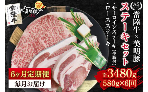 【6ヶ月定期便】【常陸牛 A5ランク・美明豚ステーキセット】常陸牛サーロインステーキ300g+美明豚ロースステーキ280g(140g×2枚) 冷凍 国産牛 和牛 牛肉 豚肉 ブランド豚 茨城県 水戸市 食べ比べ セット商品 国産 老舗精肉店 (EK-19_2)