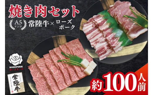 常陸牛A5ランク・ローズポーク焼肉セット 合計約100人前!|焼肉 BBQ カルビ ロース バラ 国産牛 和牛 牛肉 豚肉 茨城県 水戸市 国産 老舗精肉店(EK-90)