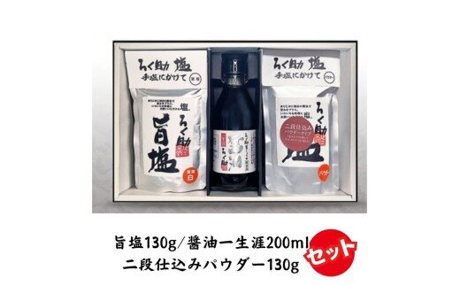 ろく助塩 一生涯セット 旨塩130g 二段仕込みパウダー130g 醤油一生涯200ml | 国産 小分け 干椎茸 昆布 干帆立貝 うま味 プラス 旨み 調味料 白塩 ソルト お弁当 出汁 醤油 お醤油 しょうゆ お料理