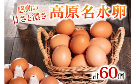 高原山のきれいな空気と水でのびのび育った鶏の高原名水卵を60個お届けいたします。