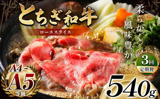 最高位賞を受賞!【定期便3回】最高級ブランドの柔らかく風味豊かなとちぎ和牛ローススライス 540g(すき焼き・しゃぶしゃぶ用) | 霜降り 和牛 切り落とし とろける 品質 柔らかく 銘柄牛 安心 安全 美味しい おいしい 芸術品 特産品 ふるさと 納税 栃木県 那珂川町 送料無料
