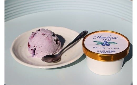 濃厚なブルーベリーミルクのジェラートに、はなぶさ有機農園の大きくて甘いブルーベリーがまるごと入っています。
