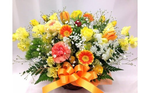 季節のフラワーアレンジメント(黄色オレンジ系)×1個 ※幅約34cm×高さ約19cm ※お花を選ぶことはできません。 |