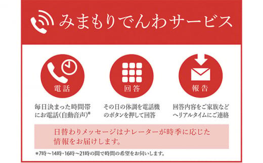 蓮田市で暮らす親御さまに、毎日携帯電話あてにお電話(自動音声)で体調確認を行い、その結果をご家族さまへお知らせするサービスです。