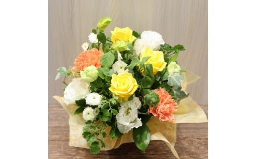 <イエロー・オレンジ系:バラ、カーネーション+季節のお花>生花アレンジメント【1379556】