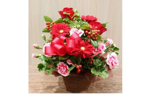 ■お礼品の内容について ・レッド系 生花アレンジメント[1個] 原産地:埼玉県ふじみ野市/製造地:埼玉県ふじみ野市/加工地:埼玉県ふじみ野市 ■原材料・成分 【サイズ】 奥行き25cm × 幅25cm × 高さ30cm 【メイン花材】 バラ、ガーベラ 【サブ花材】 その他花材は季節や仕入れ状況によって変わります 【資材・ラッピング】 茶系のラッピングをいたします |