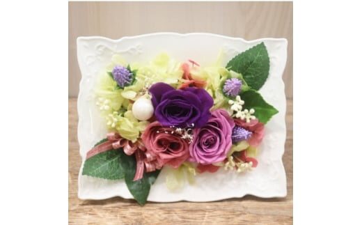 フラワー装飾のプロが制作した記念日などのプレゼントにお勧めのパープル系プリザーブドフラワーです。