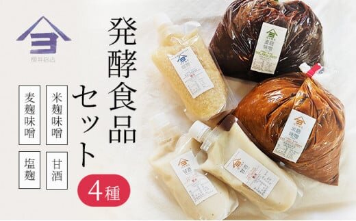 櫻井麹店がお届けする発酵食品米麹味噌、麦麹味噌、甘酒、塩麹のセットです。