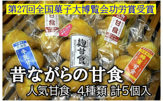 容量 | 甘食(3個入)×2袋、麹甘食(3個入)×1袋、蜂蜜甘食(3個入)×1袋、牛乳甘食(3個入)×1袋 合計5袋 |