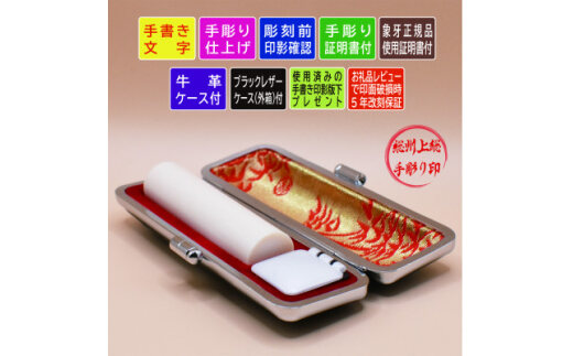 ・本象牙…天然本象牙は気品溢れる肌触りと適度な重量感があります。耐久性が高い上にきめが細かいので朱の付きが良く押印時の用紙への写りがとても良いです。当店は、特別国際種事業者(象牙製品を取り扱う事業者)として登録しております。(登録番号:第03465号)※お取り寄せ商品につき、お時間をいただくことがございます