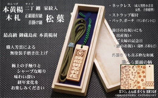 本黄楊 二丁纏サイズ1個 ・正絹根付紐ストラップ ・ネックレス用首掛け紐 ・桐箱入(スリーブ・手提げ袋) ※ネックレスサイズ:女性、子供向け (男性には小さ目) ※ストラップサイズ:縦60mm×横20mm×厚み5mm ※紐カラー:松葉 ※和柄:とんぼ ※彫刻:表面に家紋、縦に文字を彫刻(6文字まで文字数によりバランス調整いたします) |