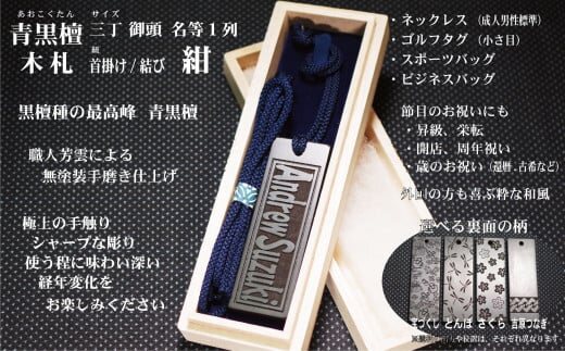 青黒檀 三丁御頭サイズ1個 ・ネックレス用首掛け紐 ・ネームタグ用結び紐 ・桐箱入(スリーブ・手提げ袋) ※ネックレスサイズ:男性定番サイズ ※ネームタグ用結び紐サイズ:縦75mm×横25mm×厚み5mm ※紐カラー:紺 ※和柄:宝づくし ※彫刻:8文字まで(アルファベットは横書き12文字まで(大文字小文字区別有)) |