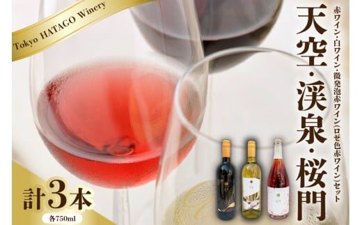Tokyo HATAGO Winery 赤ワイン 『天空』 (テンクウ)& 白ワイン 『渓泉』 (ケイセン)& 微発泡赤ワイン(ロゼ色赤ワイン) 桜門 (オウモン)3本セット 各750ml