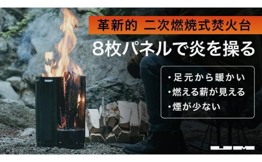 この焚火台は「二次燃焼」と呼ばれる高効率で煙が少ない燃焼が可能となる機能を持ちます。そして従来の二次燃焼式焚火台が抱えていた、使用者が暖まりづらい、燃えている薪が見えない、薪の消費が早い、という課題を8枚の取り外し可能なパネル構造で解決しています。