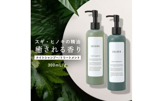 仕事や家事などで毎日忙しい日々に。岐阜県飛騨地方のスギや三重県のヒノキの樹木から抽出した精油などをブレンド。森林浴をイメージした落ち着きのある香りで「1日の終わりに心地よい癒しの時間」をお届けするルルーナのナイトシャンプー&トリートメントセット。