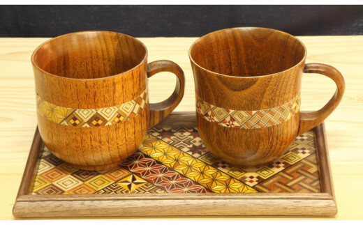 【箱根寄木細工 マグカップ2つと寄木盆のセット】伝統工芸品で素敵なひと時を