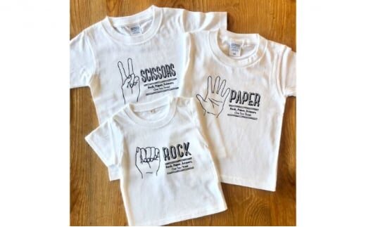 Tシャツにはそれぞれ、「ROCK」「PAPER」「SCISSORS 」の文字とじゃんけんマークがプリントされています。
