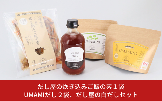 だし屋の炊き込みご飯の素 野菜五目、UMAMIだし 鰹と昆布、UMAMIだし 野菜、だし屋の白だしがひとつずつのセット。